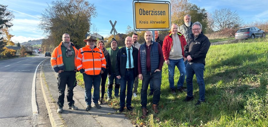 Bildunterzeilen: Zufriedene Gesichter beim gemeinsamen Ortstermin in Oberzissen: Vertreter der Verbandsgemeinde Brohltal, der Ortsgemeinde Oberzissen, des Landesbetrieb Mobilität, des Ingenieurbüros Hartwig und der ausführenden Firma L. Elenz freuen sich über die frühzeitige Freigabe der L 111 – rund sechs Wochen vor dem ursprünglich geplanten Termin.